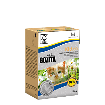 Bozita Feline Kitten zeichnet sich durch einen hohen Fleischanteil aus (91% Fleisch im Häppchen), enthält natürliche Vitamine und Mineralstoffe und ist leicht verdaulich. Mit frischem schwedischen Hühnchenfleisch zubereitet, das sich durch eine hohe Verdaulichkeit auszeichnet. Das Futter ist natürlich reich an Taurin und Selen und enthält ausserdem MacroGard®, ein natürliches β-Glucan, das die körpereigene Abwehr der Katze stärkt.